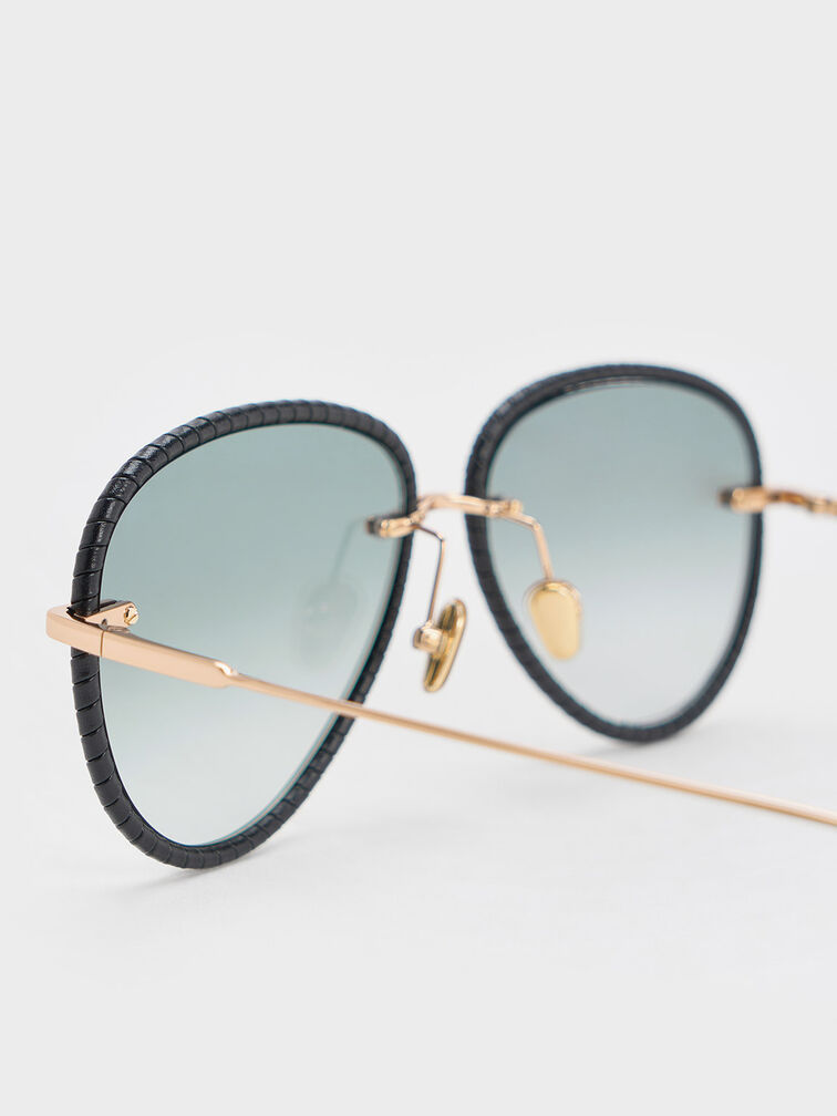 These aviator sunglasses feature a modern twist -- braid leather trims adorn the teardrop-shaped lenses, adding a subtle yet sophisticated charm to their timeless design. Crafted from nappa sheep leather, they offer an indulgent sense of comfort. The black braid trims create a beautiful contrast with the sleek gold-toned metal accents, which will elevate any outfit with a touch of glamour.