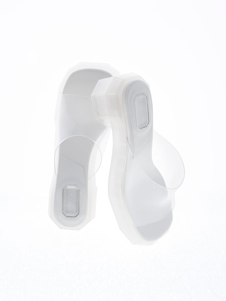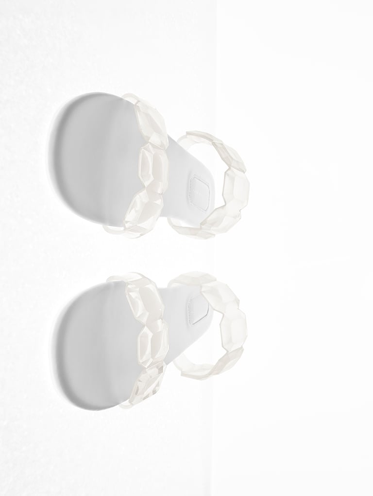 Jelly shoes, a popular summer staple, take on a kaleidoscope of colours — a nod to the saccharine sweetness of childhood gem pops. The Fia see-through slide sandals and geometric heel mules are maximalist must-have styles for long, hot days.
