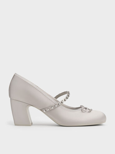 Sepatu Pumps Mary Jane Gem-Embellished Bow Satin - Light Grey