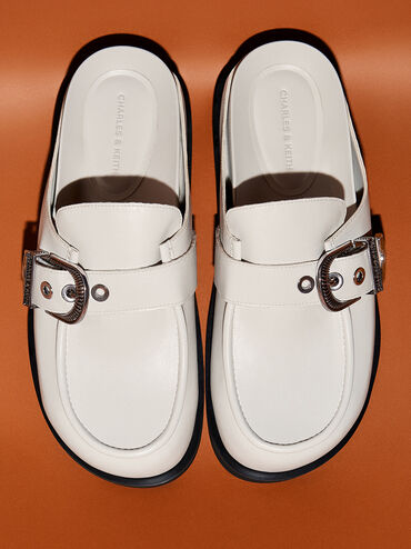 Cerahkan wardrobe Anda dengan mules flatform putih bersih ini, yang sama chic dan versatil seperti versi hitamnya. Dilengkapi strap buckle dengan motif Western yang eye-catching, memungkinkan Anda untuk mencoba tren cowboy saat ini. Buckle-nya juga memiliki finishing burnished yang memancarkan rugged elegance. Membuat statement untuk footwear chunky, mules flatform ini akan menambahkan sentuhan maskulin yang cool pada outfit apapun.