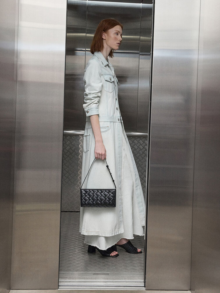 Anda tidak akan pernah salah dengan tas hitam kecil, dan tas bahu elongated woven Ivette sangat serbaguna. Cocok untuk berbagai kesempatan, Anda bisa menyelipkannya di bawah lengan atau menggunakannya sebagai tas selempang. Tas ini terbuka ke interior yang luas di luar dugaan yang akan menampung semua barang penting Anda sehari-hari dengan mudah.