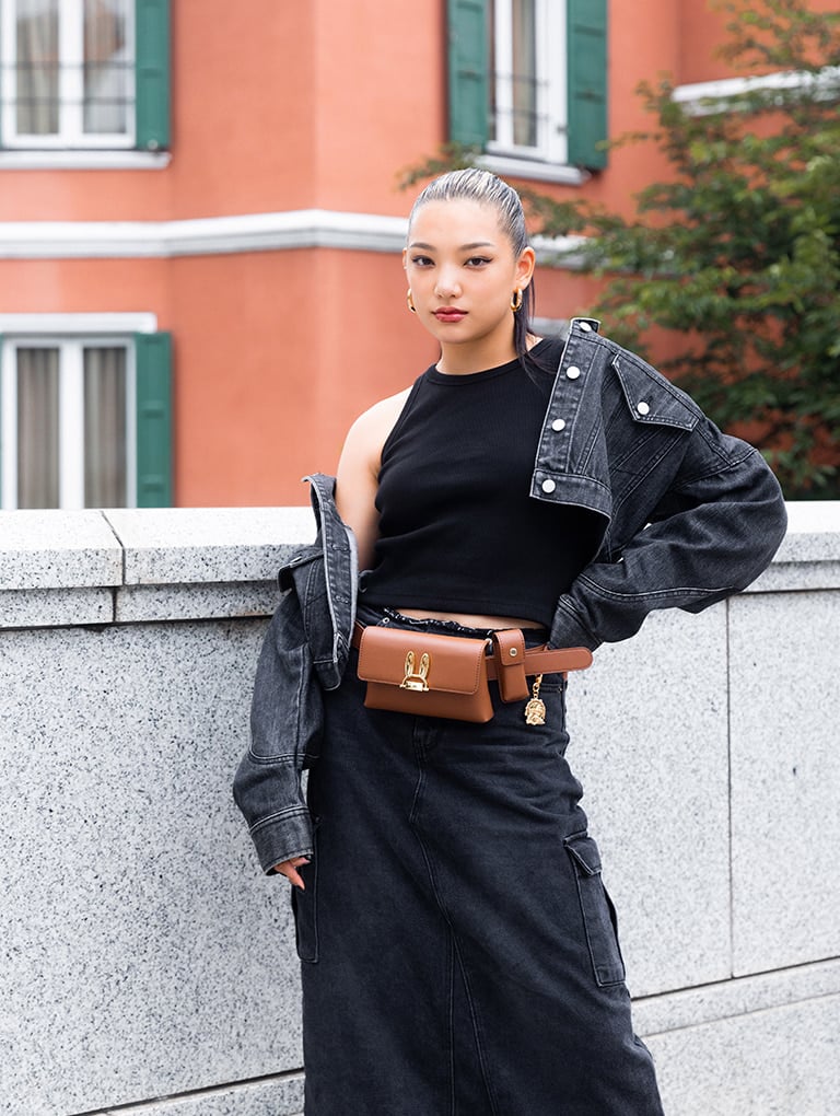 Merepresentasikan estetika cool-girl dengan open-collared top, low waist cargo pants dan sepatu Judy Hopps chain-strap Mary Janes berwarna hitam, digital creator Suan Bei memilih belted Judy Hopps printed sebagai statement piece untuk sentuhan akhir yang unik.